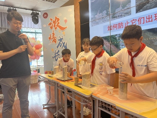 活动中,土木工程系教工党支部党员教师为小学生们开展了有趣的科普讲座。王苏然博士以地震滑坡之谜为主题,介绍滑坡灾害和对我们的危害,并且带领小朋友做了土体颗粒滑动原因小实验。同学们通过实验,了解了土体颗粒滑动的原因和滑坡灾害的严重性,增强了他们的安全意识。