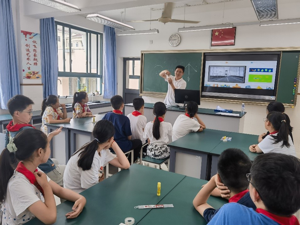祝青鑫博士以走近桥梁为主题,介绍桥梁发展动态和我国桥梁建设成就,他带领小朋友们尝试做“小小桥梁设计师”,采用A4纸、胶带等材料设计搭建桥梁,并进行糖果加载试验。同学们通过自己动手设计和实践,深入了解了桥梁的结构和原理,增强了他们的创新能力和团队合作精神。