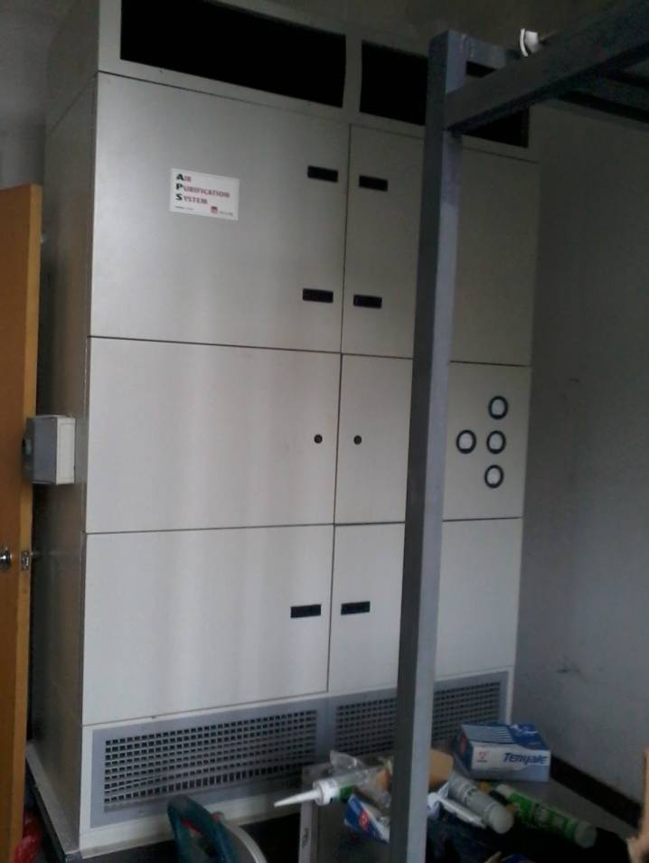 该实验系统目前正进行施工安装,预计2012年10月完成。所建空气净化实验台工作原理为:使洁净气体通过一风量箱(最小流量68m3/h,最大流量1375 m3/h),在风量箱的加气口添加研究用、具有一定浓度污染物,含有污染物的气体在风量箱内混合均匀,然后使含污染物的气体经过第一个孔板均流段测试其污染物浓度后,经过净化器试验样机后的第二个孔板均流段,再次测试气体污染物浓度,然后含污染物的气体经过系统净化器,待残留污染物被清除后再次回到风量箱,依此循环。所用净化机选用活性炭纤维进行空气污染物净化,实验系统见图27。试验通过净化器试验样机前后不同污染物浓度、气体流速获得净化器样机净化效率。试验台可进行不同净化器性能研发与新型净化器的开发创新研究。