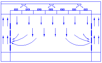 层流洁净室目前正进行施工安装,预计2012年10月完成。洁净室尺寸为4445mm×3200×2100mm,室内面积14.2m2。工作人员通过洁净室入口处的风淋室进出洁净室。洁净室屋顶满布FFU,满布比为65.6%,FFU风机电机为直流无刷型,室内气流速度范围0.4m/s-1.0m/s。FFU布置以及侧墙回风口布置如图25所示。实验室地板采用高架地板,以形成下回风,从而室内形成垂直层流的气流组织,同时洁净室两侧墙面开有回风口,可形成上送侧回的准层流洁净室气流组织形式,根据回风口高度不同,上送侧回形式略有不同详见图26所示,实验室两侧为回风夹墙,回风道近屋顶侧布有干盘管显热换热。洁净室设计新风量为120m3/h,最大新风量可实现1000m3/h,新风机组采用粗效、中效、高效三级过滤,采用的过滤器分别为G4、F6、H13型,FFU过滤器效率为H14。室内正压可保持15Pa。