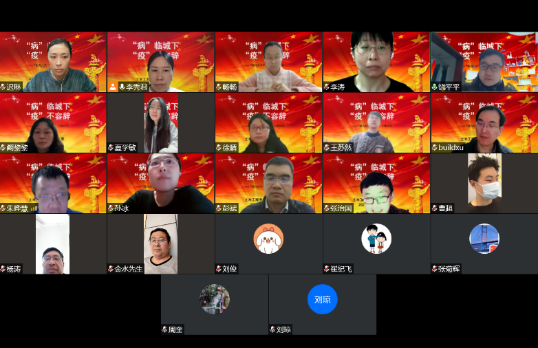 当前上海的新型冠状病毒感染肺炎疫情形势严峻复杂,正处于最吃劲的关键阶段。为进一步增强支部党员抗疫的责任感、使命感,引导党员干部在抗击疫情中践行初心使命,发挥先锋模范作用,土木工程系教工党支部通过腾讯会议、支部微信群等方式开展抗击疫情动员活动,支部在4月2号通过腾讯会议开了了“‘病’临城下、‘疫’不容辞”战役主题活动,支部书记李秀君传达了学校党委对党员的要求,主要强调了强化政治责任及巩固拓展党史学习教育“我为群众办实事”长效机制,倡议全体党员教师实践疫情防控中党员的担当、作为。除了要立足自身岗位职责,在线上教学中践行立德树人,上好疫情防控思政大课外,还建议老师们积极参与社区志愿者工作,在急、难、险、重任务中当先锋、作表率。支部多位党员积极投入社区志愿者工作,受到居民及所在居委会同志的一致好评。